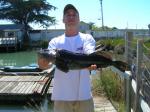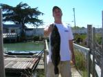 Aug 28 '07, And my sons first day back in school, WOOHOO! So I hit the South Jetti at 10:30ish on the incomin tide. I started at marker 34 again and met with a dude who owns a tackle shop in Weaverville that I have met before while we got snowed in in Weaverville on our way back from Red Bluff.  We chatted for a minute about meetin b4 and he was asking about how I was rigged up. I showed him and he rigged up the same and we were fishin. He got slammed and had a nice fighter, but after a few seconds it spit the hook. He re-rigged and soon got broke off in the rocks and then said somethin about going to 'get some heavier gear and he'd be back again'. I kept moving down and had a real nice bite that I totally flubbed up and missed. I had to leave at 2 and it was gettin past 1 so I started shortening my cast stops and movin faster down the rocks. Right in between marker 29 and 28 I got a nice little tap on my line, I set the hook and felt it was a good fish. It put up a nice fight with quite a few bursts and runs. I brought it up and saw a nice Ling. I got it on a rock for a quick measure and it was right at 24", so I took it off the rocks for a better measure. It still measured 24" so I cut it and went back over the rocks. I fished until 1:45 and figured I had just enough time to get home, gut the Ling and be at my kids school by 2:50. I was just a little late.