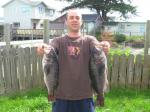 My step brother came up to visit for a couple of days and wanted to do some rockfishin. Thursday we hit the South Jetti at about 10 am. The tide was high and the water was a little swelly but there were no currents so my lures would stay where I wanted them. We were throwing different soft plastics texas rigged. My brother hooked up pretty quick and brought up a nice Black Rockfish. It was about 10:30 and we were quite a ways out the jetti when Clayman rolled up and started fishin with us. I got the next bite and stuck a nice 3 1/2# Black Rocky. Clayman got a Brown and I got another nice Black. I hooked up on a 20", 4 lb 4 oz Cabezon next and then Clayman hooks a 18" Cabezon not too long after. I got a good hit and brought up a nice Ling that slipped off at the surface run. I was bummed and kept puttin it in the same place. A couple minutes later I missed a good hit but tried again. This time I stuck it good! I brought up the same Ling as before. It measured 24 1/2" so I cut it and went back to work. After that we weren't stickin any more hits, although we were gettin plenty of them. 2:30 came around too soon and we had to bail. We left Clayman there and I was jealous about it. I knew there were plenty more fish to be caught and Clayman told me about some of them later.