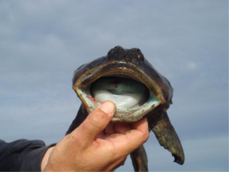 Down the jetti the current was really cuttin along the rocks and made it difficult to cast out at all. I turned to the 'Little Dipper' and started working holes with a soft plastic crab, texas rigged. I missed a couple of bites, it was slow for a while. One bite I missed came from a submerged rock right in front of me. It was a good hit so I put it right back there. A nice hit again and I thought I had another fat Greenie on the line. I started bringing it up a little but it had another idea and started taking me down. Wow, the 'Little Dipper' is a beast! My reel has a drag locking feature which I keep locked for some stupid reason. I had to switch that real quick or I think something was going to break. Some awesome runs and I thought I had either a very spirited Ling or a niiiiice Cabezon. I brought it up once before another run and saw all Brown. I thought it was going to be a big Grass Rockfish but no, it was a Cab.