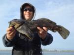I didn't get the Ling but I did get a fat little Greenling. Tossed it back and kept working the dolo holes. I missed a couple gnarly strikes that I want to say were Cabezon but who knows. No more fish there so we started to move back down the jetti. A lot of people had a lot of fish, mostly fat Greenies. I saw another dude come out of the dolos with a nice little Cab and a fat Greenie.