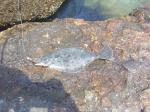 I spent two hours (1-3pm) working the incoming tide for one dink sand bass and three pancake size halibut. All fish were fooled on a 3 inch Big Hammer in Xmas tree color, 1/4 oz leadhead, with a slathering of Unibutter.